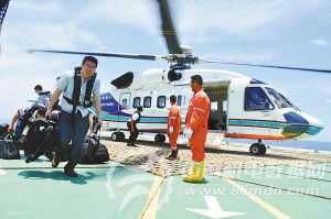 工作人员乘坐南航珠直直升机抵达油气平台。