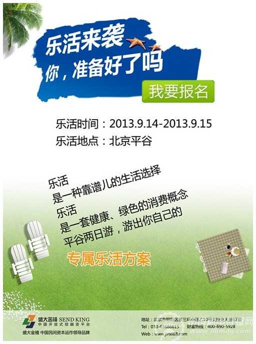 全程免费!凡参与问卷调查者,均有机会获得盛大金禧提供的中秋节平谷乐活两日游机会。凡我公司前100名投融资意向客户在活动前成交的,直接获得参加资格!(暂限北京地区)