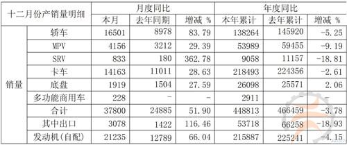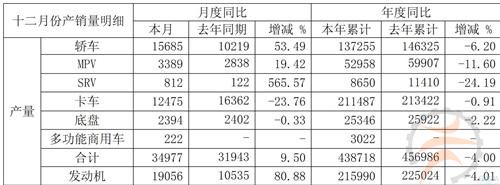 新产多功能商用车222辆。12月产量合计34,977辆,较2011年12月的31,943辆同比增长9.50%。发动机为19,056台,从10535台同比增长80.88%。