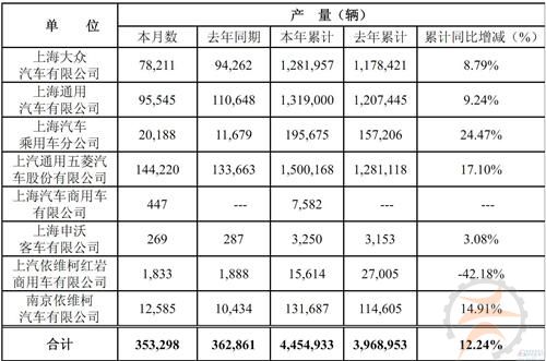 上汽集团12月产量为353,298辆,2012年12月362,861辆,同比下滑2.64%。全年产量为4,454,933辆,2011年为3,968,953辆,同比增长12.24%。