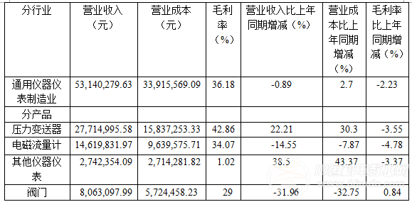 报告期内,主营业务仍然为自动化仪器仪表的研发、生产和销售,利润来源未发生重大变动。报告期内,压力变送器的营业收入同比增长22.21%,主要原因是公司去年适当调降压力传感器的销售价格,抢夺了竞争对手的一部分市场,使得压力传感器销售数量有了较大的提高;电磁流量计的营业收入同比下降14.55%,主要原因是受到了市场需求不振的影响,销售量有所下滑。公司毛利率较去年同期下降2.23%,主要原因是制造人工成本增加;此外,低毛利率的压力传感器销售增加,也使公司整体毛利率有所下滑。此外,2013年上半年度,公司新增专利申请2项,其中1项为发明专利,1项为实用新型。