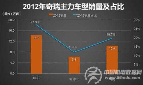 虽然奇瑞在将品牌回归后改变了“游戏”套路,意在打“精品牌”、“品质牌”,但目前的产品阵容还是主要靠一些低端产品来创造营收,就拿2012年奇瑞单一车型的销量来说,QQ3全年销售143802台,占奇瑞总销量27.29%;瑞虎全年销量104013台,占奇瑞总销量19.74%;奇瑞E5全年销售62847台,占奇瑞总销量11.93%;以上这些车型才是奇瑞目前的主力,但它们的定位相对略低。