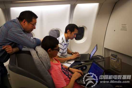 旅客只需带上自己的Pad或笔记本就可在安装第二代机上无线网络系统的网络航班上看到更多高清电影、新闻、图书,听到更多的音乐。图为工作人员进行网络调试。