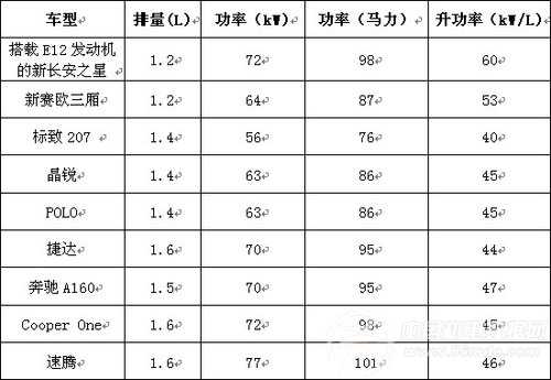 上表可以明显看出,E12在同级别小排量发动机中功率和升功率均领先对手将近13%,而与合资品牌汽车1.5L及1.6L排量的发动机相比也丝毫不逊色,功率仅比1.6L的速腾稍低,而比差距最大的标志207高出将近30%,升功率优势更加明显,也就是说E12“喝最少的油,办最多的事”,这在同级别的发动机市场上处于绝对优势,澎湃动力全面满足了消费者的需求。