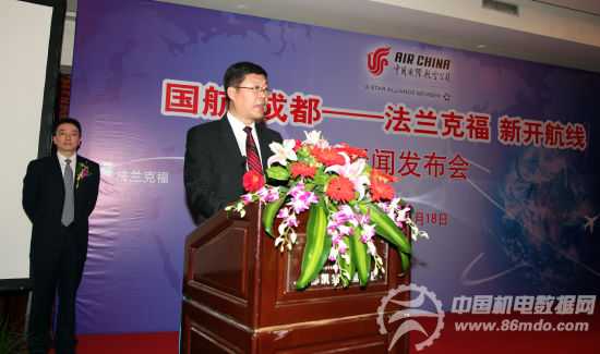 18日下午,国航在成都举行新闻发布会,向公众发布法兰克福开航信息。四川省政府副秘书长范波、德意志联邦共和国驻成都总领事馆总领事安介儒博士、四川省政府口岸办公室主任李熊、国航股份总飞行师兼西南分公司总经理刘铁祥、国航商委西南营销中心总经理罗勇军、国航西南分公司党委书记许志山、副总经理刘政等与国航销售代理人代表及25名主流媒体记者参加发布会。