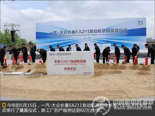 大众未来采用MQB平台车型的陆续推出,作为该平台重要组成部分的EA211引擎需求量将大幅增加。在今年5月15日一汽-大众长春EA211发动机项目正式动工,以提升该系列发动机的产能,对此一汽-大众董事、总经理张丕杰表示:“长春EA211发动机工厂的建立,标志着一汽-大众"核+芯"的全产业链布局逐渐完善。”与此同时网通社了解到新工厂建成后将投产包括1.0T及1.2T在内的多款引擎。