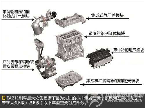 EA211发动机是目前大众集团旗下最为先进的小排量发动机。同时网通社了解到新款发动机较EA111引擎相比,采用了诸如主动气缸关闭、双可变气门正时技术在内的多种高新技术,并通过全新调教使其动力参数同样拥有高/低功率两种,全铝构造的应用使其重量进一步降低。