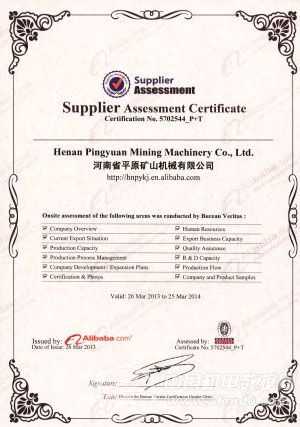 2013年3月下旬,河南平原矿山机械有限公司通过了法国国际检验局(Bureau Veritas)的实地认证,取得了BV证书,这标志着河南平原矿山机械有限公司的质量管理水平已经进入规范化、标准化的轨道,并处于稳定上升状态,并逐步迈上成熟的管理阶段。