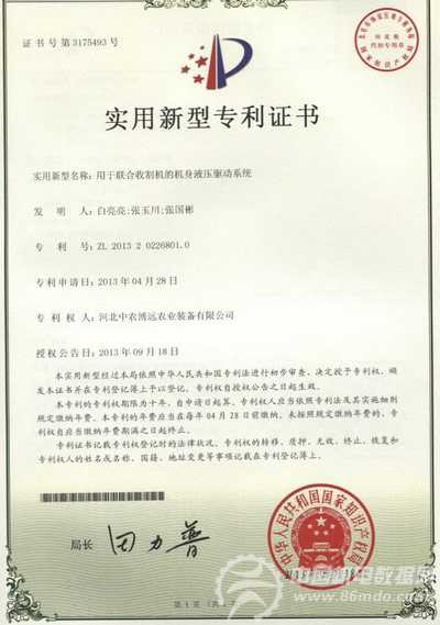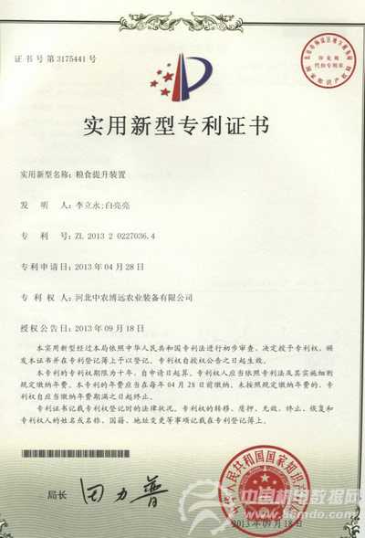 日前,中农博远四项实用新型专利获得国家知识产权局授权,专利名称分别为“旋转常结合卸粮系统”,专利号:ZL 2013 2 0211559.X;“玉米收获机侧翻粮仓”,专利号:ZL 2013 2 0187122.7;“粮食提升装置”,专利号:ZL 2013 2 0227036.4;“用于联合收割机的机身液压驱动系统”,专利号:ZL 2013 2 0226801.0。