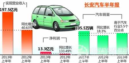 沪深最牛渝股半年报出炉。昨天晚间,长安汽车[-1.27%资金研报](000625)公布了2013年半年报,实现营业收入197.5亿元,同比增长40.63%,其中净利润13.3亿元,为沪深渝股第一,同比增长133.49%,每股收益0.29元。长安汽车有关负责人表示,长安汽车位于重庆垫江的试验场将于9月底运营。