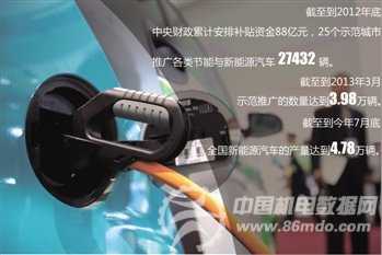 权威数据显示,截止到2012年底,中央财政累计安排补贴资金88亿元,25个示范城市推广各类节能与新能源汽车27432辆,截至2013年3月示范推广的数量达到3.98万辆,截至今年7月底,全国新能源汽车的产量达到4.78万辆。