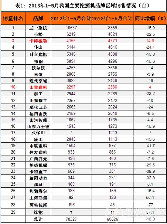 从表1可以看出,2013年1-5月,中国挖掘机行业销量前20名中,除卡特彼勒、山重建机外,同比上年同期均出现不同幅度的下滑。三一和小松继续位居行业前两位,但均出现较大幅度下滑。值得注意的是,全球工程机械领头羊卡特彼勒首次跻身中国挖掘机行业前三强。2013年,卡特彼勒在持续加大对中国市场的投入,同时加快了推出适合中国用户需求新产品的步伐。此外,卡特彼勒在市场推广、营销策略上均有所调整,以更加适应中国市场的变化。