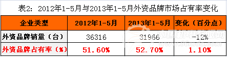 在2013年1-5月份的中国挖掘机销量排名前5位的企业中,有4家为外资品牌;在销量前10名中,外资企业占据了其中的7个席位。随着国产挖掘机品牌的日益崛起,外资在中国的销量逐渐收紧,2013年1-5月外资品牌(含合资)的挖掘机销量达31966台,同比2012年下降了12个百分点,见表2。