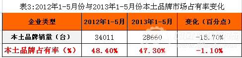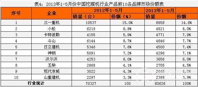 本土企业市场占有率微有下降之势在2013年1-5月份的中国挖掘机本土品牌销量为28660台,较去年同期34011台骤降15.7个百分点。本来凭借充足的产能,灵活的市场策略和深入的渠道优势,中国本土企业在市场资源的争夺中较外资企业具有先天优势,2013年1-5月份中国本土品牌挖掘机市场销量为28660台,市场占有率达到47.3%,离占据行业半壁江山也仅有一步之遥。但是值得注意的是,这几年随着来自市场层面的动力趋缓,以及中国用户的成熟、理性,加之国外企业中国竞争策略的调整、升级以及对中国小挖市场的日益重视,本土挖掘机企业的市场占有率提升速度逐渐放缓,2013年1-5月份本土品牌市场占有率首次出现下降,但是下降并不明显,仅为1.1个百分点,见表3。