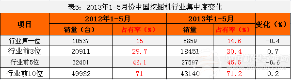 行业集中度2013年1-5月份位居行业榜眼的挖掘机企业三一重机市场占有率从2012年的15.0%降至14.6%。从整体销售市场占有率来看,在行业前5大品牌企业中,除卡特彼勒市场份额上升2个百分点外,其他几大品牌行业都或多或少呈现下降趋势,但变化依旧不是很明显,基本上处于平分秋色这样一个状态。统计位列行业前三位的挖掘机制造商,其总销量合计18451台,市场占有率为30.4%,同比上年上升了0.7个百分点;位列行业前5名的企业,销量总计27597台,市场占有率为45.5%,同比下降了0.6个百分点;位列行业前10名的企业,销量为43140台,市场占有率达71.2%,同比上升了0.2个百分点。见表4、表5。
