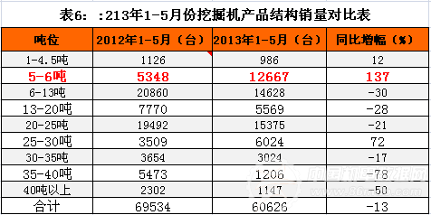 产品结构销量出现变化2013年1-5月份中国挖掘机5-6吨位产品销量出现大幅度上升,销量突破12667台,较去年同期上升137个百分点,这不得不引起挖掘机制造商和行业人士的注意。此外,1-4.5吨、25-30吨位段的挖掘机销量增幅也较大,分别上涨12%和72%。其他吨位的挖掘机出现明显的或大或小的下降,其中35-40、40吨位段以上的销量降幅较大,分别达到了78%和50%。虽然目前处于行业销量主流地位的20-35吨级产品市场占有率仍然偏高,但其销量已呈现明显下滑态势,而13吨级以下特别是5-6吨位挖掘机的销量的市场占有率日益提升,这表明中国小型挖掘机的市场前景广阔,见表6。