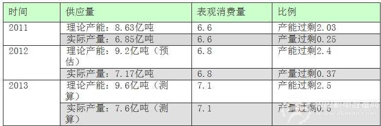而与此同时,2011年全国粗钢表观消费量为6.85亿吨,2012年可达7.1亿吨;经过钢度网测算,2013年的粗钢表观消费量可能达到7.6亿吨左右;如此来看,我国钢铁行业的产能较之表观消费量而言,确实是过剩了许多。