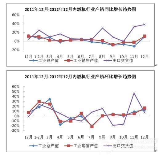 2012年12月,我国内燃机行业的工业总产值及工业销售产值的同比增速均比上月仍然有所小幅上升,出口交货值的同比增速则有小幅度上升。与此同时, 工业总产值、工业销售产值的环比增速也均比上月有小幅度的上升。出口交货值的环比增速则比上月有大幅度下滑。