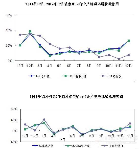 2012年1-12月份,全国重型矿山机械行业的发展形势有所回升,工业总产值和销售产值同比增速明显上升,环比增速平缓,出口交货值同、环比增速均有所回升。