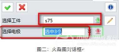 步骤一:打开中望3D,打开电极模具图,如下图一所示:红色圈圈为电极,则对其出工程图时,点击模具功能电极—火花图弹出如下对话框编辑选项。(如图二)