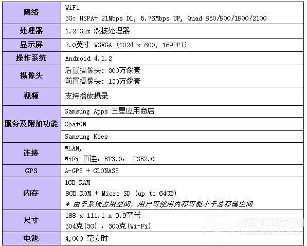 三星GALAXY Tab 3 7.0”(3G版、WiFi版)参数表: