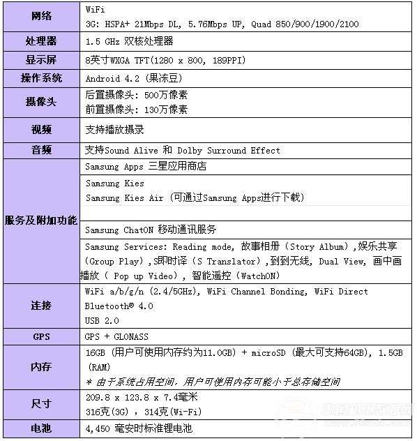 三星GALAXY Tab 3 8.0”(3G版、WiFi版)参数表: