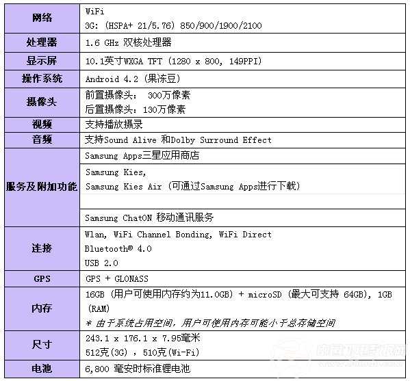 三星GALAXY Tab 3 10.1”(3G版、WiFi版)参数表: