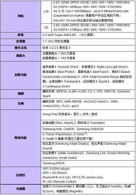 GALAXY S4 mini配备4.3英寸qHD炫丽屏(Super AMOLED),设计小巧,机身仅重107克,更适宜用户随身携带和单手操作。同时,GALAXY S4 mini将便携性与强劲性能完美平衡,它搭载了1.7GHz 双核处理器,能帮助用户轻松、快速地处理日常工作生活所需。