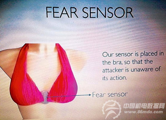 他将“恐惧传感器”装在胸罩里、能贴近肌肤,与使用者的手机与蓝牙连结,当感测到使用者散发恐惧、僵硬的讯息,就会自动传送“Help Me”(救我)的简讯,给预先拟好名单上的人,并且附有求助者的位置。