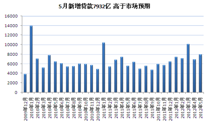 央行今日公布的2012年5月金融统计数据报告显示,5月当月人民币贷款增加7932亿元,同比多增2416亿元;当月人民币存款增加1.22万亿元,同比多增1143亿元。5月末,广义货币(M2)余额90.00万亿元,同比增长13.2%;狭义货币(M1)余额27.86万亿元,同比增长3.5%。