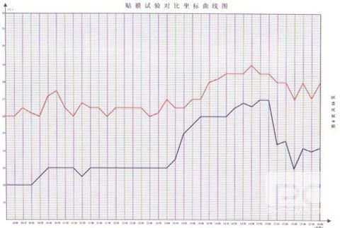 整个玻璃贴膜试验日期为2002年7月31,天气情况为白天阴、最高气温33℃、偏南风2至3级、空气平均相对湿度80%(依据2002年7月31日北京市天气预报),在列车空调制冷和周围环境相同的同等条件下进行贴膜对比试验。