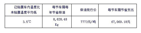 根据北京铁路局旅客空调列车玻璃贴膜试验结果报告和数据计算结果表明:在列车空调制冷和周围环境相同的同等条件下,已贴膜列车车内温度要比未贴膜列车车厢内温度平均低3.5℃,每节车厢每年可节省柴油为8,628.48Kg,按0#柴油现行采购价2,700元/吨计算,每节可节省支出为67,069.18元。