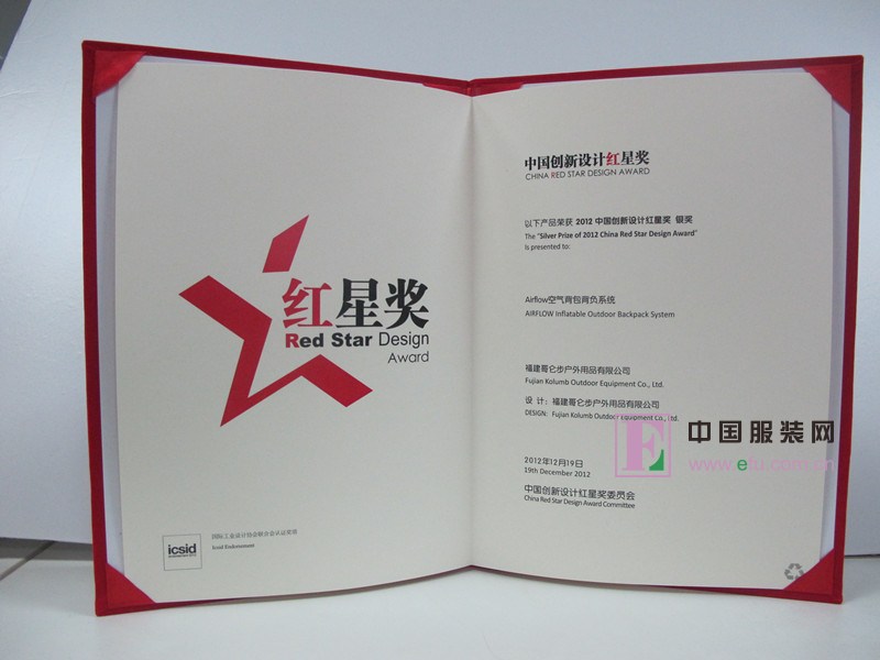 2012中国设计红星奖颁奖典礼于12月19日在万事达中心M空间隆重举行,由kolumb(哥仑步)户外用品自主设计的“Airflow空气背包背负系统”斩获中国创新设计红星奖银奖,“K-FIT全方位保护登山鞋”、“快速充气帐篷”也分获中国创新设计红星奖。Kolumb(哥仑步)户外品牌在设计端的卓越表现,再次获得工业设计界的权威认可和肯定。