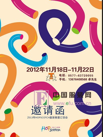 跳格子HOPSCOTCH童装 2013年春夏订货会将于2012年11月18日至22日在温州总部针对全国的经销商和加盟商举行新品发布及订货会,我们有着高速成长的品牌影响力,独特、创新的商业模式,充满设计力且具有优异品质的产品支撑,高效专业的软硬件技术支持,营销模式的多元化整合;本次的新品发布会更是设计师们精心打造和设计的最时尚、舒适、自信、健康的HOPSCOTCH童装品牌,同时奉上最优惠的招商政策,欢迎各优质的代理商和加盟商莅临参观;